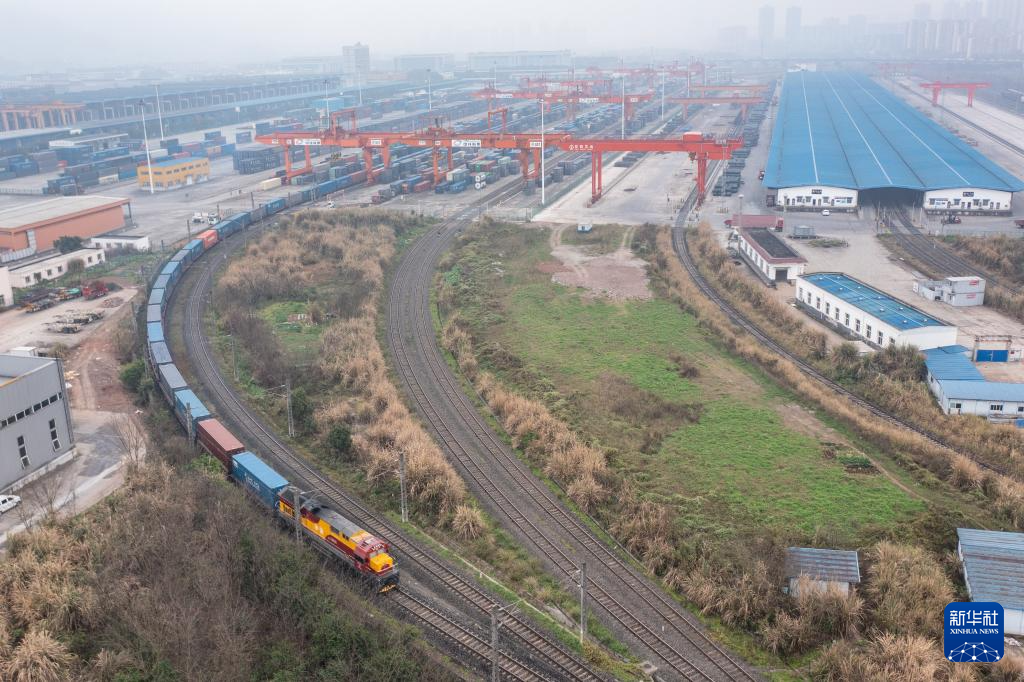3月7日,一列滿(mǎn)載機(jī)械設(shè)備、整車(chē)及零部件等貨物的中歐班列從重慶團(tuán)結(jié)村中心站駛出(無(wú)人機(jī)照片)。