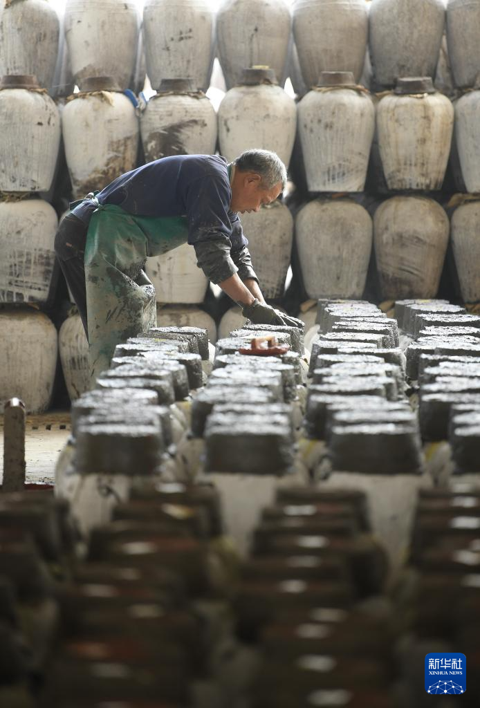 3月15日,在位于紹興市柯橋區(qū)的浙江塔牌紹興酒有限公司,釀酒師傅給春榨結(jié)束的黃酒糊泥頭封壇。