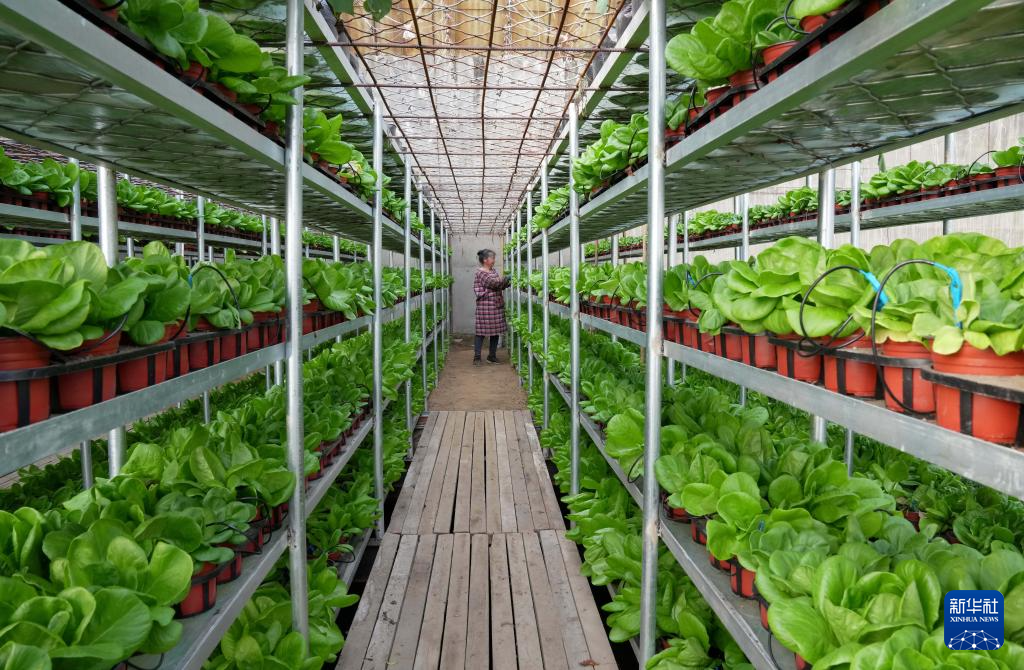 3月16日,河北省秦皇島市撫寧區(qū)撫寧鎮(zhèn)一家蔬菜種植合作社社員在大棚內(nèi)管護(hù)采用立體栽培技術(shù)種植的生菜。