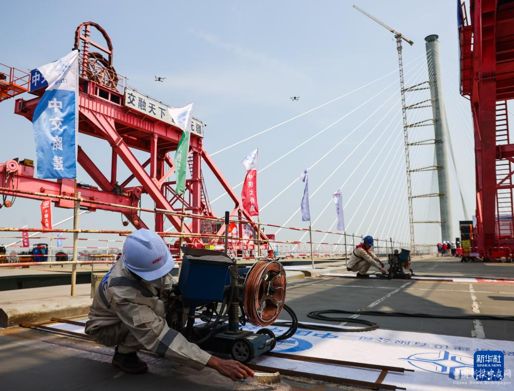 3月20日,建設(shè)者在黃茅??绾Mǖ栏邫诟鄞髽蛑骺绾淆埩憾蔚淖詈笠欢魏缚p進(jìn)行焊接。