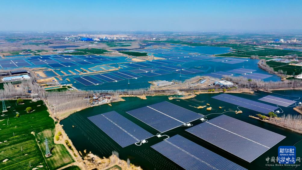 3月20日拍攝的微山縣驩城鎮(zhèn)利用采煤塌陷區(qū)約3600畝水面建設的漁光互補項目。該項目集光伏發(fā)電、漁業(yè)養(yǎng)殖、生態(tài)修復于一體(無人機照片)。