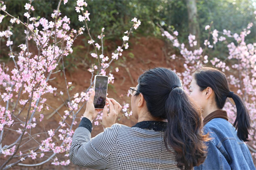 游客拿起手機,將鏡頭對準枝頭,留下美麗的倩影。(謝鑫攝)