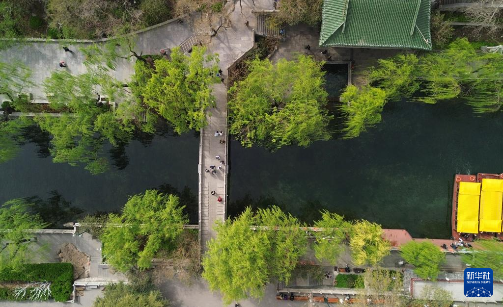 近日,山東省濟南市護城河泉水涌動、兩岸春意盎然,吸引不少市民和游客前來游覽。