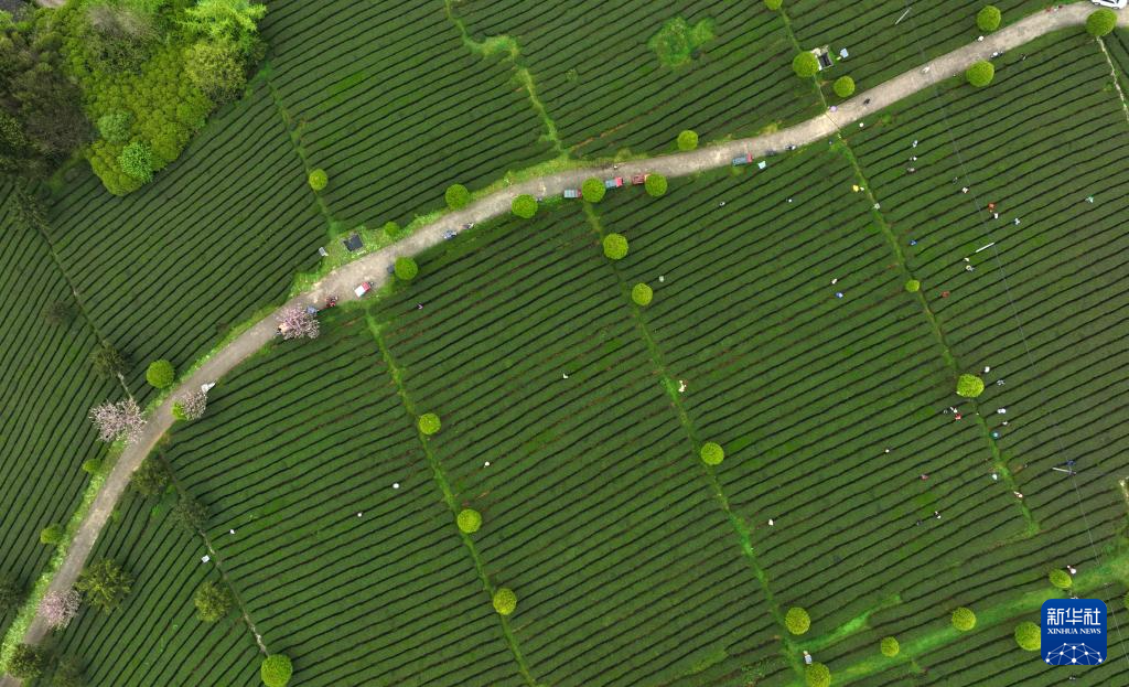 4月5日,村民在貴州省遵義市余慶縣松煙鎮(zhèn)二龍村茶場采摘春茶(無人機照片)。