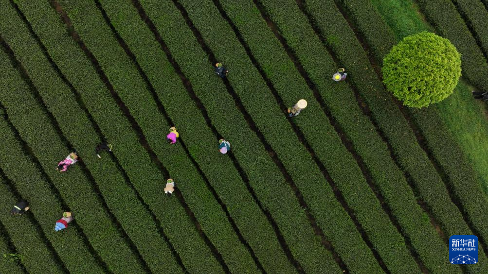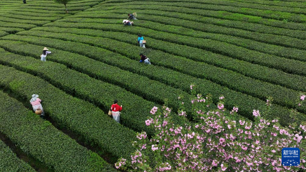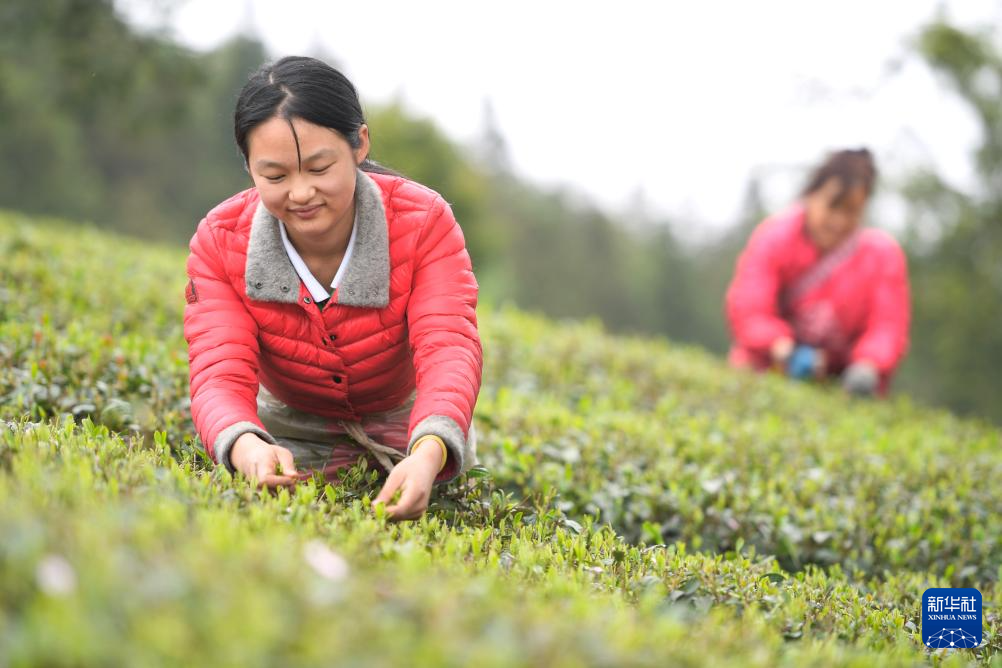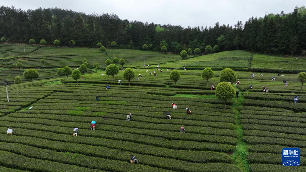 4月5日,村民在貴州省遵義市余慶縣松煙鎮(zhèn)二龍村茶場采摘春茶。