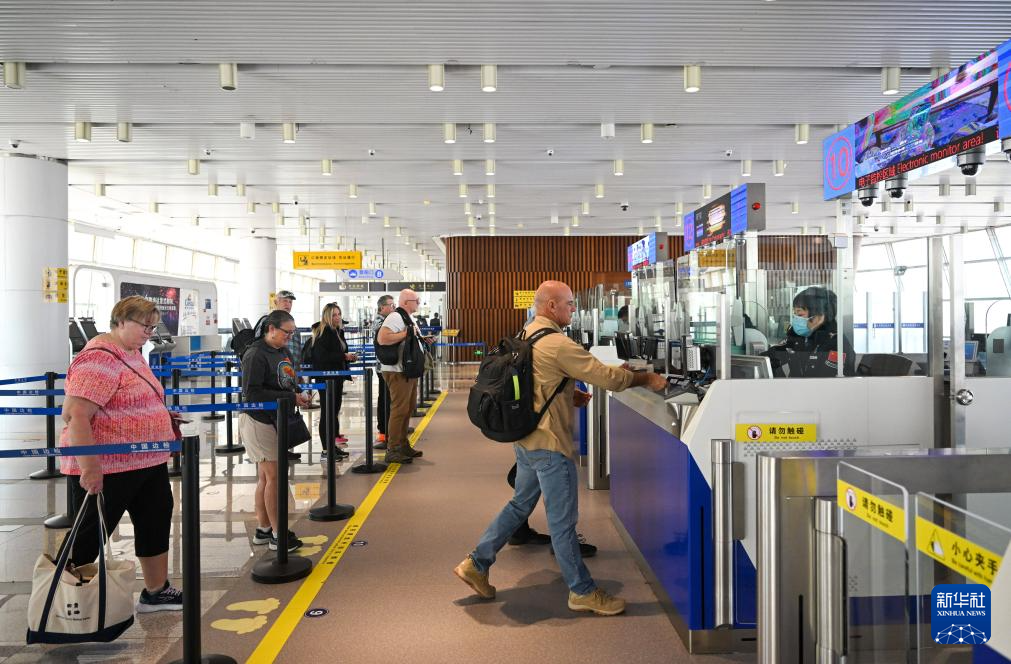 4月7日,外籍旅客在通關(guān)入境后準(zhǔn)備前往景區(qū)游玩。