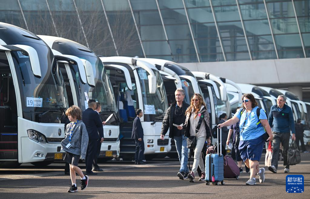 4月7日,外籍旅客準(zhǔn)備搭乘大巴車前往京津旅游景點(diǎn)。