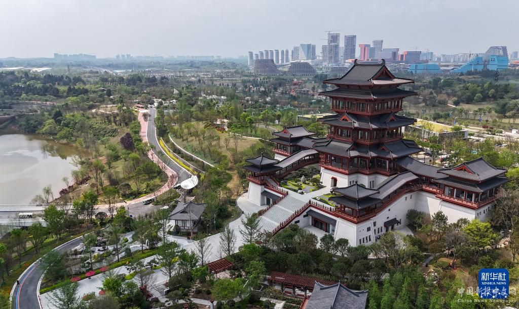 成都世園會(huì)主會(huì)場(chǎng)里的錦云樓(4月12日攝,無人機(jī)照片)。