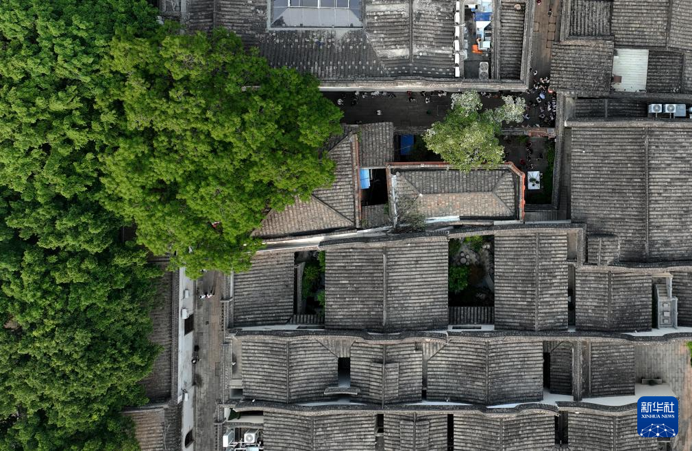 游客在福州千年古街三坊七巷衣錦坊觀賞盛開的流蘇花(4月14日攝,無(wú)人機(jī)照片)。