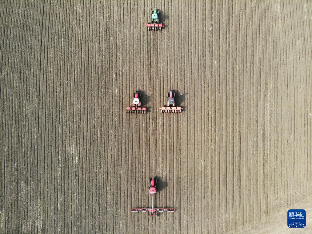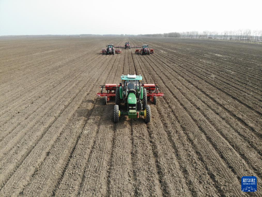 4月25日,在黑龍江北大荒農(nóng)業(yè)股份有限公司友誼分公司第五管理區(qū)一地塊,大馬力農(nóng)業(yè)機械進行玉米播種作業(yè)(無人機照片)。