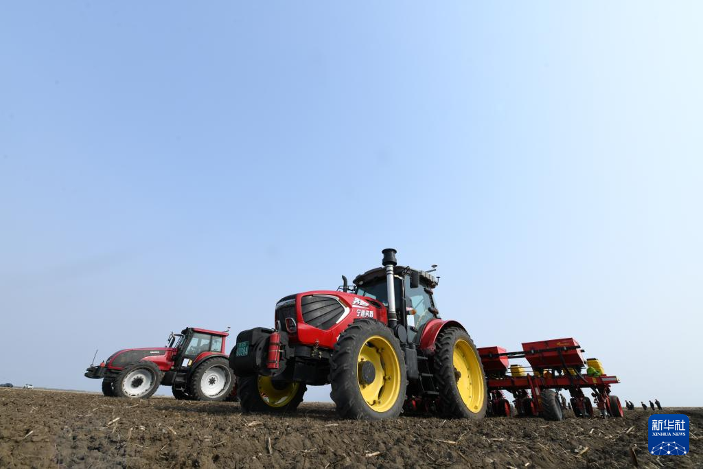 4月25日,在黑龍江北大荒農(nóng)業(yè)股份有限公司友誼分公司第五管理區(qū)一地塊,大馬力農(nóng)業(yè)機(jī)械進(jìn)行玉米播種作業(yè)。