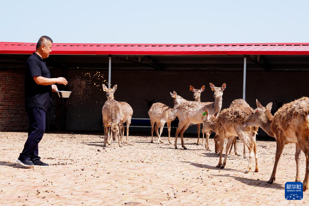 4月27日,在惠民縣姜樓鎮(zhèn)鹿豐養(yǎng)殖場,工作人員在喂梅花鹿。