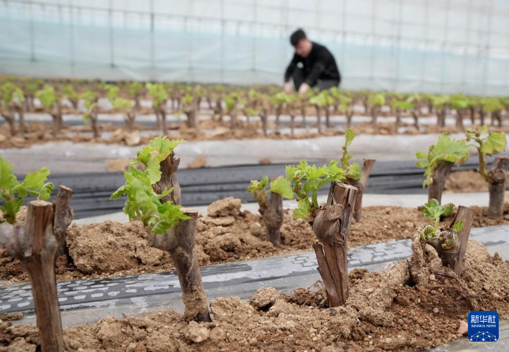 4月29日,河北省昌黎縣十里鋪鄉(xiāng)耿莊村果農(nóng)在管護(hù)新品種葡萄苗。