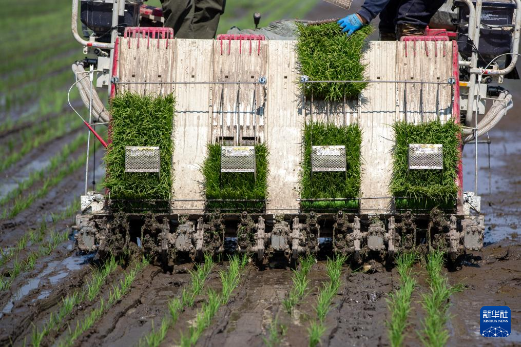 5月8日,在北大荒集團前哨農(nóng)場有限公司的水田里,農(nóng)民操作高速插秧機進行水稻插秧作業(yè)。