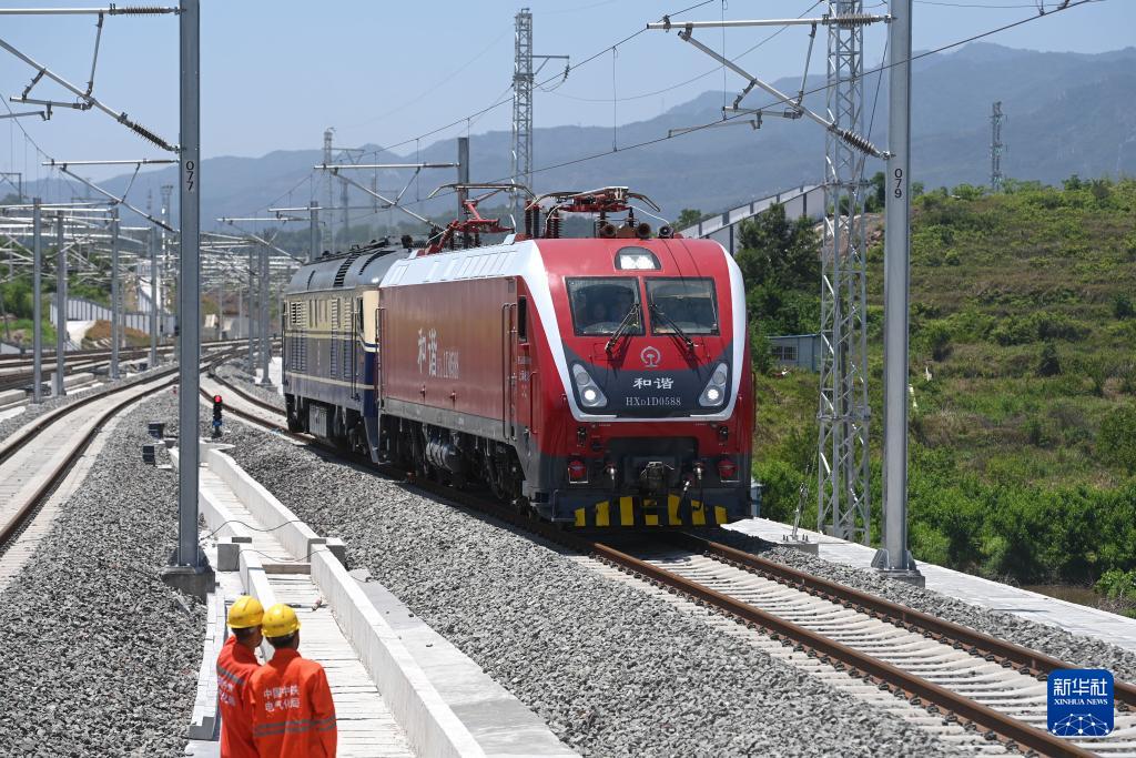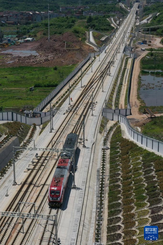 5月14日,首趟熱滑試驗(yàn)列車(chē)行駛在杭溫高鐵橫店站附近的線路上(無(wú)人機(jī)照片)。在接觸網(wǎng)帶電情況下,熱滑試驗(yàn)列車(chē)以不超過(guò)80公里時(shí)速開(kāi)展試驗(yàn),通過(guò)受電弓的滑行,精確檢測(cè)接觸網(wǎng)與受電弓的弓網(wǎng)關(guān)系和受流網(wǎng)壓等參數(shù),確認(rèn)相關(guān)設(shè)備設(shè)施達(dá)到聯(lián)調(diào)聯(lián)試條件。