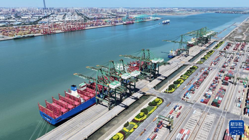 5月15日,“中遠(yuǎn)海運(yùn)山茶”輪靠泊在天津港太平洋國際集裝箱碼頭裝載貨物(無人機(jī)照片)。