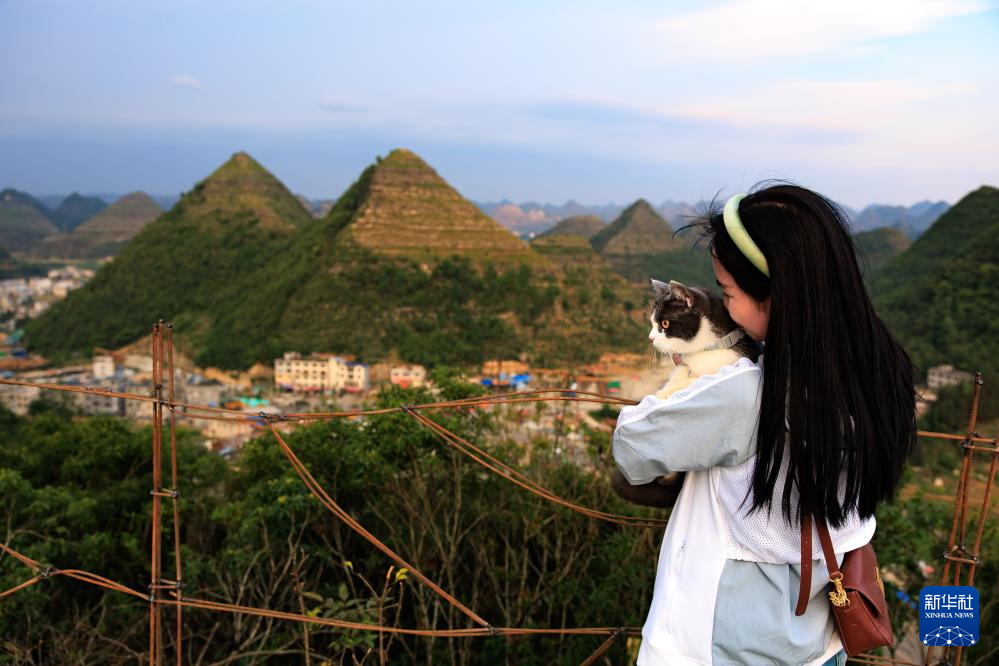 游客帶著小貓觀賞安龍縣郊外形狀酷似金字塔的山體(5月14日攝)。
