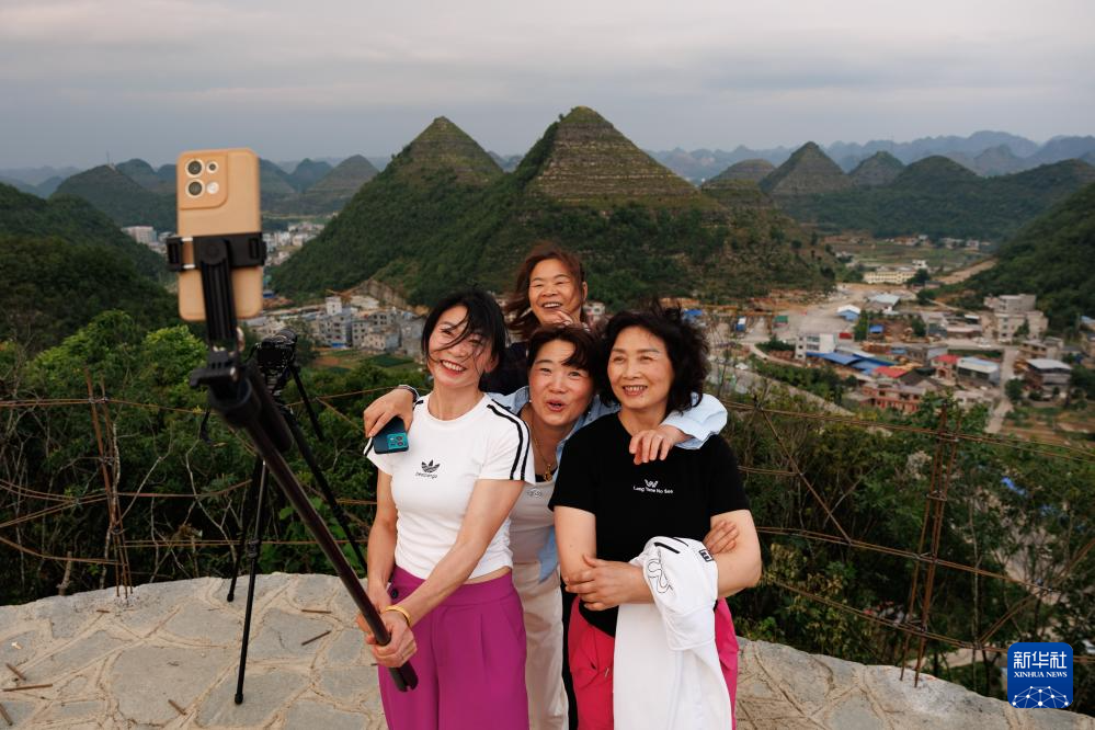在安龍縣郊外,游客與形狀酷似金字塔的山體合影留念(5月14日攝)。