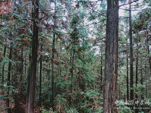 日前,我們來到坪臺村天臺山景區(qū)登高一看,從棉花沖至蟬家沖一帶的數(shù)里青山連成一片,林濤翻滾,青翠欲滴。深入林區(qū),發(fā)現(xiàn)樹徑20公分以上的杉木林大徑材不少。老支書無不自豪地說:“那年搞林改,我們打著‘擦邊球'堅(jiān)持村集體林場公山不下戶,如今保留的這1100多畝杉木林,每畝材積達(dá)到了8立方米,總蓄積量達(dá)到了5600立方米,按現(xiàn)木材市價計(jì)算,已為村集體經(jīng)濟(jì)積累了448萬元的‘綠色'資產(chǎn)。”