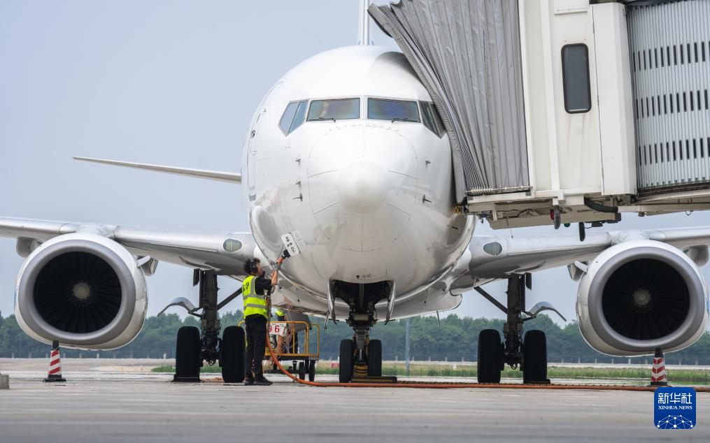 5月22日,湖北宜昌三峽國(guó)際機(jī)場(chǎng)工作人員為一架到達(dá)的客機(jī)接入橋載電源。