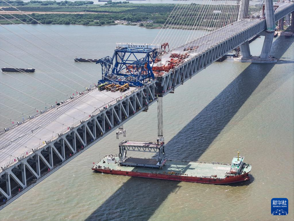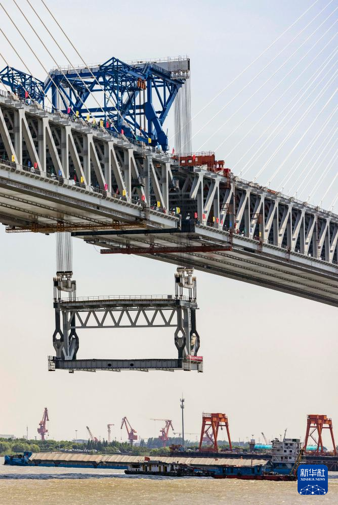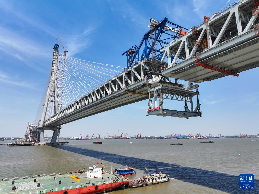 5月29日拍攝的常泰長江大橋主航道橋合龍段鋼桁梁吊裝現(xiàn)場。