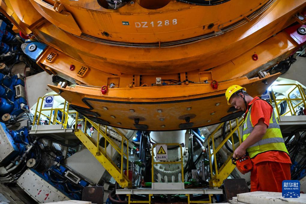 5月30日,施工人員在檢查“鯤鵬號(hào)”盾構(gòu)機(jī)設(shè)備運(yùn)行狀況。