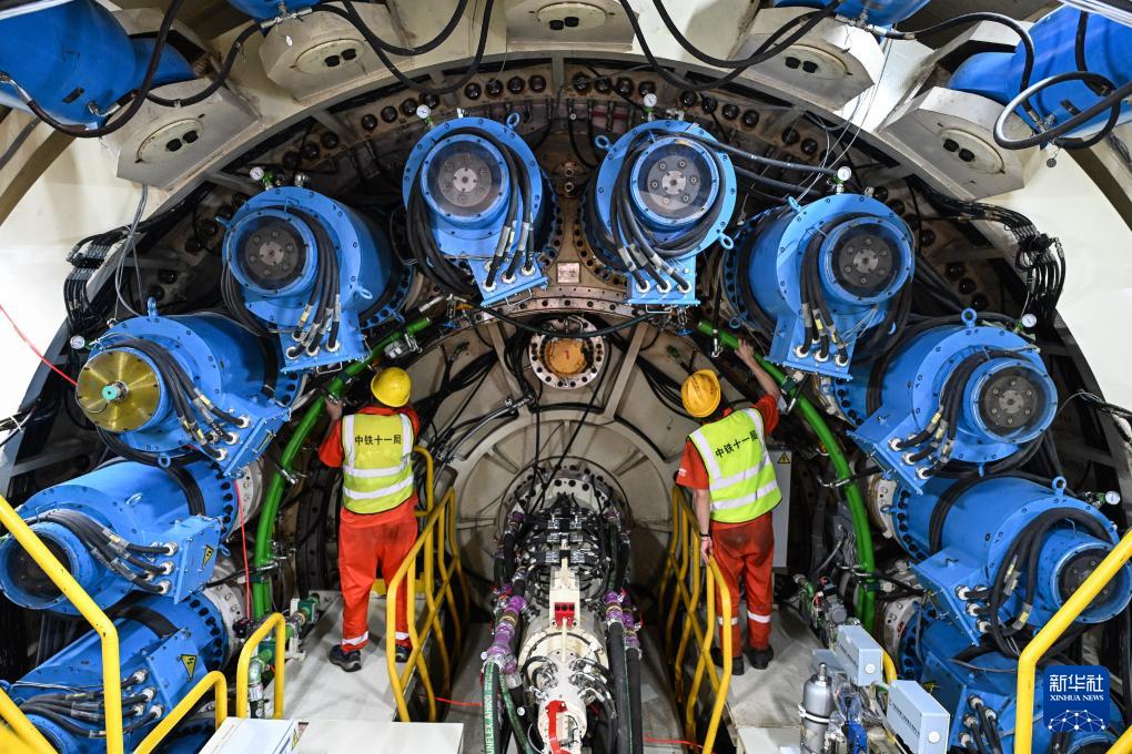 5月30日,施工人員在檢查“鯤鵬號(hào)”盾構(gòu)機(jī)刀頭組件運(yùn)行狀況。