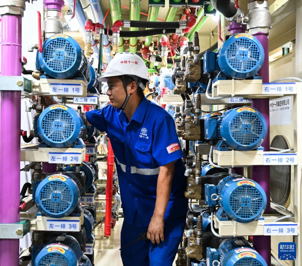 5月30日,施工人員在查看“鯤鵬號(hào)”盾構(gòu)機(jī)組件運(yùn)行狀況。