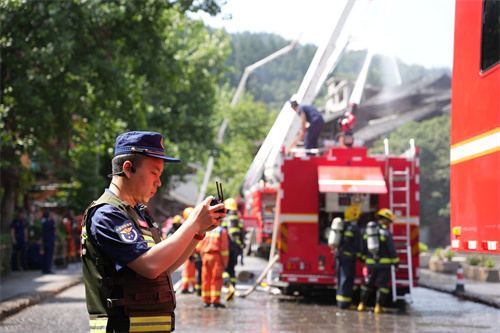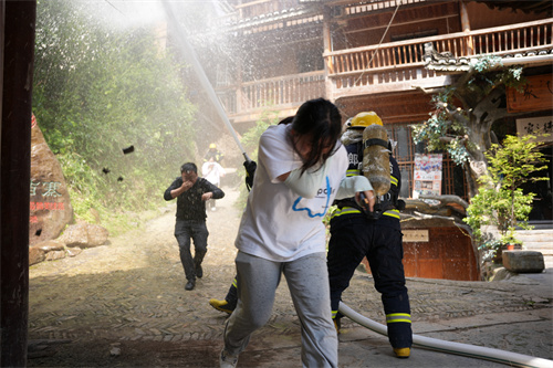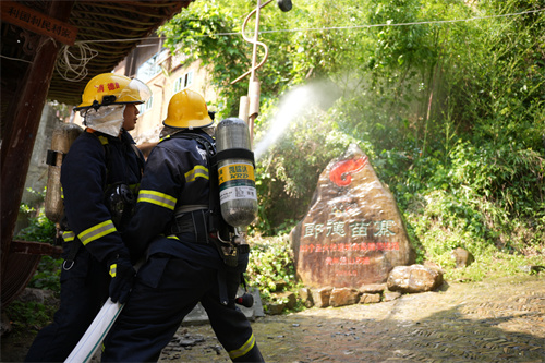 此次演練假設(shè)雷山縣郎德鎮(zhèn)郎德下寨村大區(qū)域民房著火,火災(zāi)迅速蔓延擴大引起村寨上方森林火災(zāi),形成寨火山火同時猛烈燃燒災(zāi)情。鑒于郞德鎮(zhèn)屬于50戶以上木質(zhì)連片結(jié)構(gòu)村寨,一旦發(fā)生火情會迅速擴大蔓延,演練總指揮部采取突擊調(diào)派,實戰(zhàn)實訓(xùn)的形式,設(shè)置了鳴鑼喊寨、村寨自救、初戰(zhàn)控火、供水保障、內(nèi)攻救人、屬地調(diào)派、跨區(qū)域增援、?;钒徇\、多部門協(xié)同聯(lián)動等9個實戰(zhàn)科目,先后調(diào)集黔東南、黔南、銅仁三個消防救援支隊和國家消防救援局貴州機動隊共22車、155名消防指戰(zhàn)員,以及公安、森防辦、供電、醫(yī)療、衛(wèi)健、通訊公司等8個部門聯(lián)動力量10車35人參與處置。