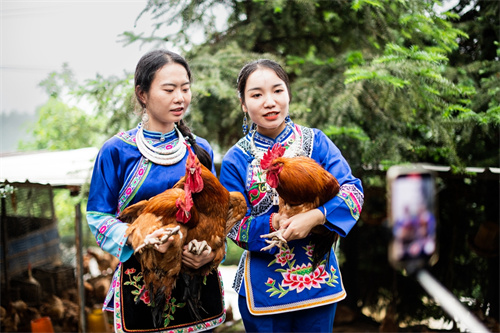 天柱縣農(nóng)投公司員工在“棲鳳油茶園”直播銷售紅土雞。