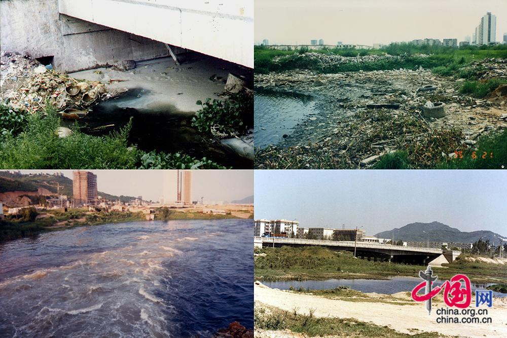 曾經(jīng)的筼筜湖湖區(qū)雜草叢生、污水四溢,生態(tài)嚴重惡化。圖為筼筜湖治理前資料圖。
