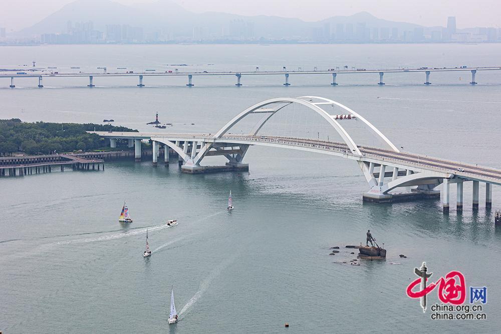 站在高處俯瞰位于廈門島東北部的五緣灣,海岸線向遠方蜿蜒綿亙,由五座大橋組成的五緣灣大橋巍巍矗立,橋下不斷有帆船和游艇穿行在波光粼粼的海面上。中國網(wǎng)記者 倫曉璇 攝