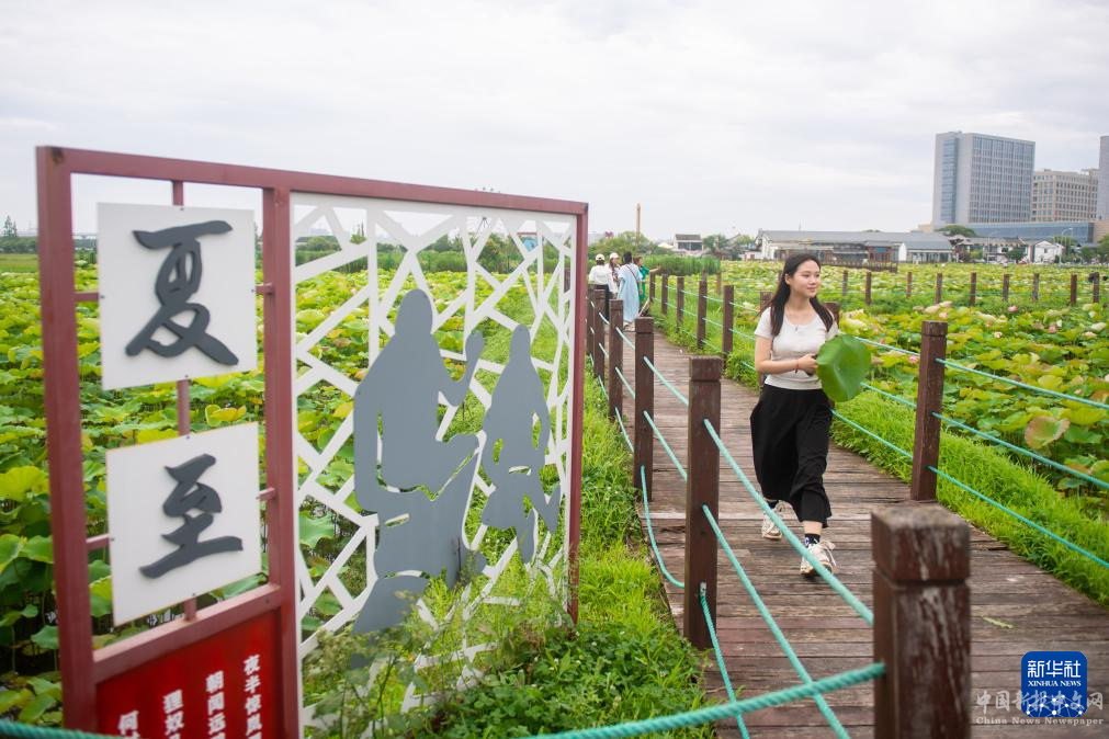 夏至節(jié)氣將至,浙江省寧波市江北區(qū)外漕村百畝荷田的荷花綻放、荷葉連綿,吸引市民前來賞荷游玩。