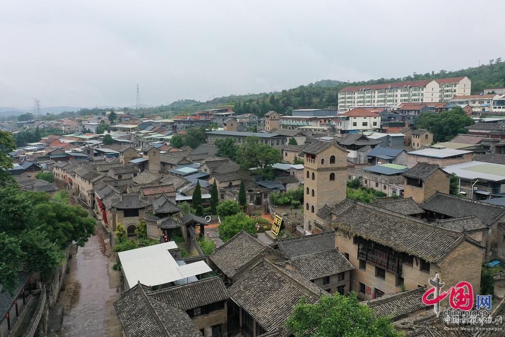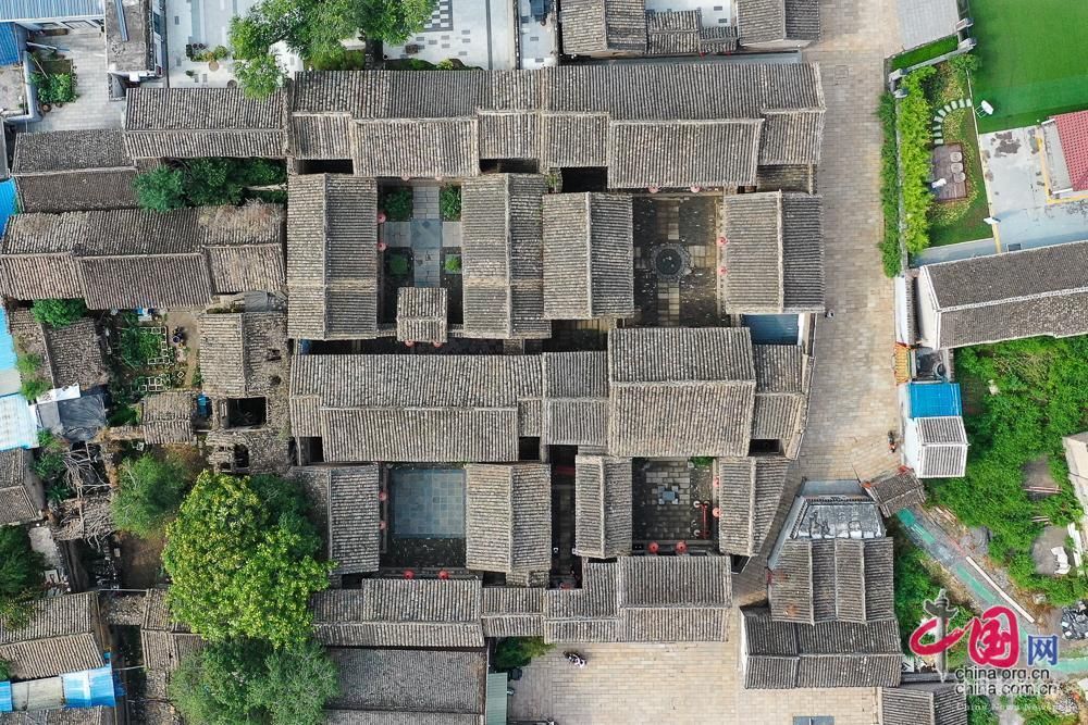 俯瞰大陽(yáng)古鎮(zhèn)一分街村萬里茶道博物館,形似棋盤,又稱“棋盤四院”。中國(guó)網(wǎng)記者 董寧 攝影