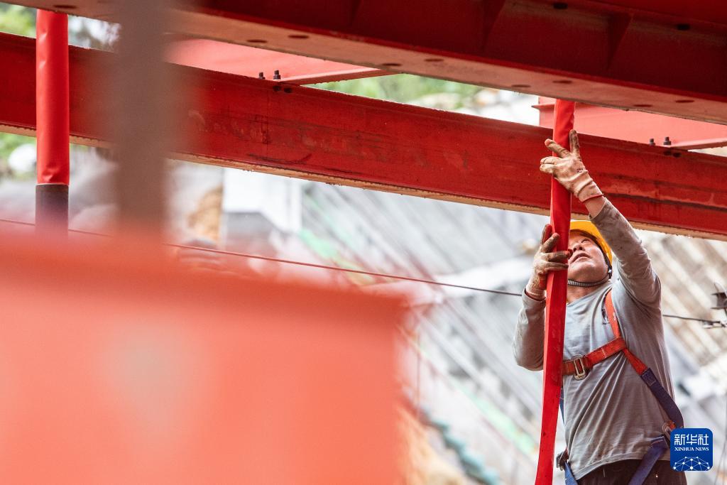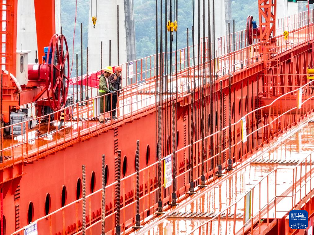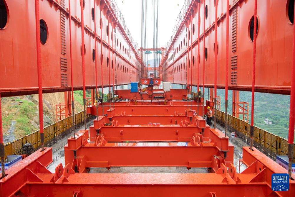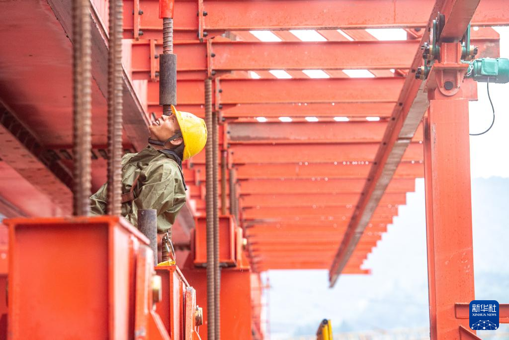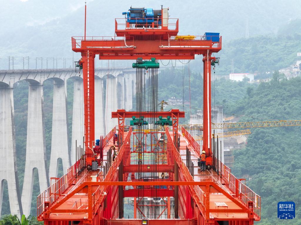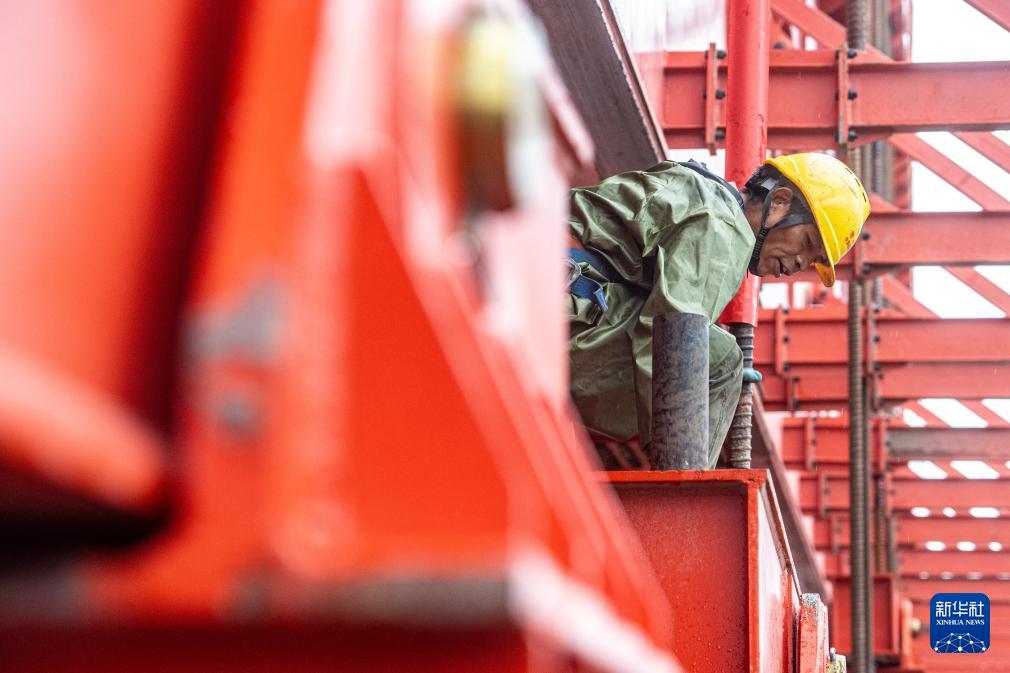 6月26日,渝萬高鐵新橋雙線特大橋建設(shè)現(xiàn)場,工人在架橋機(jī)上作業(yè)。