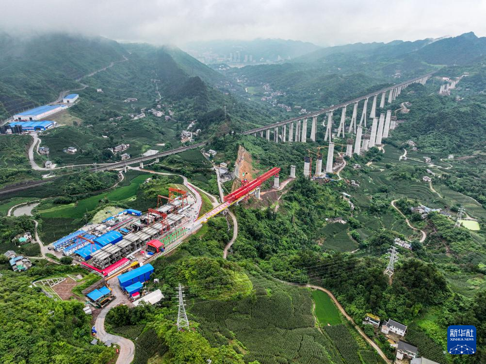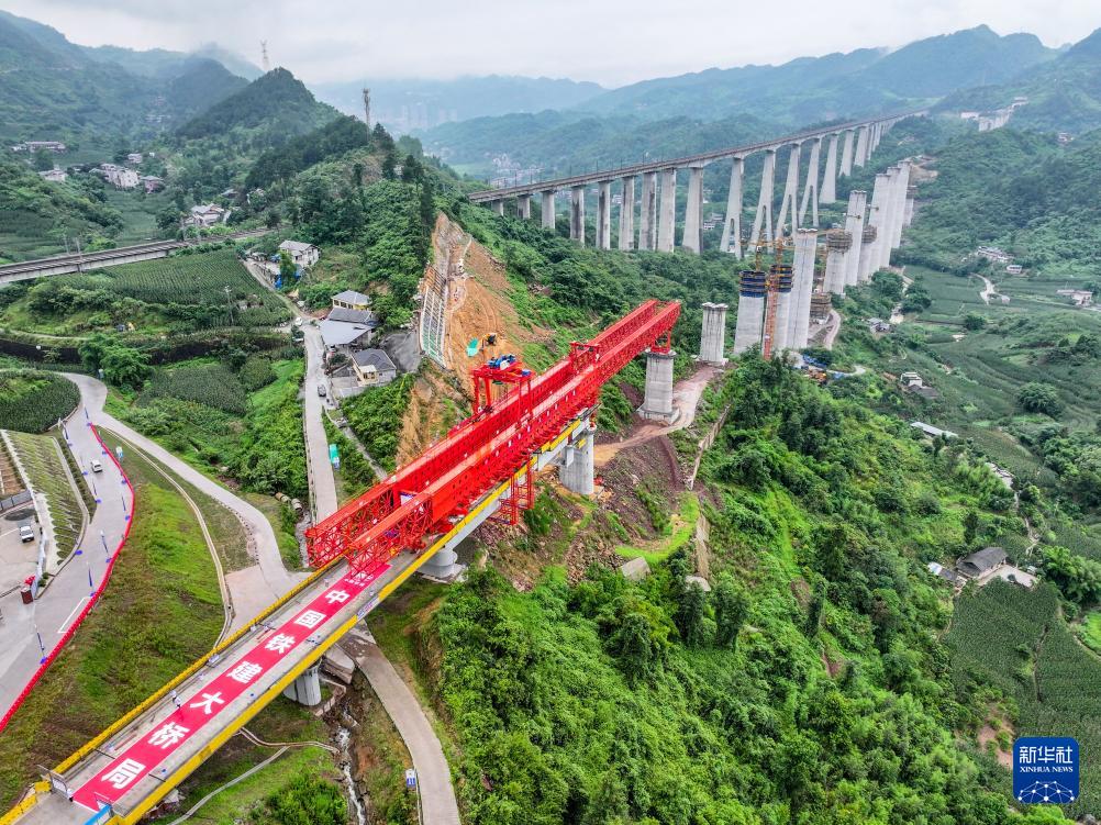 6月26日,渝萬高鐵新橋雙線特大橋建設(shè)現(xiàn)場,架橋機(jī)在架設(shè)首孔64m節(jié)段拼裝梁(無人機(jī)照片)。
