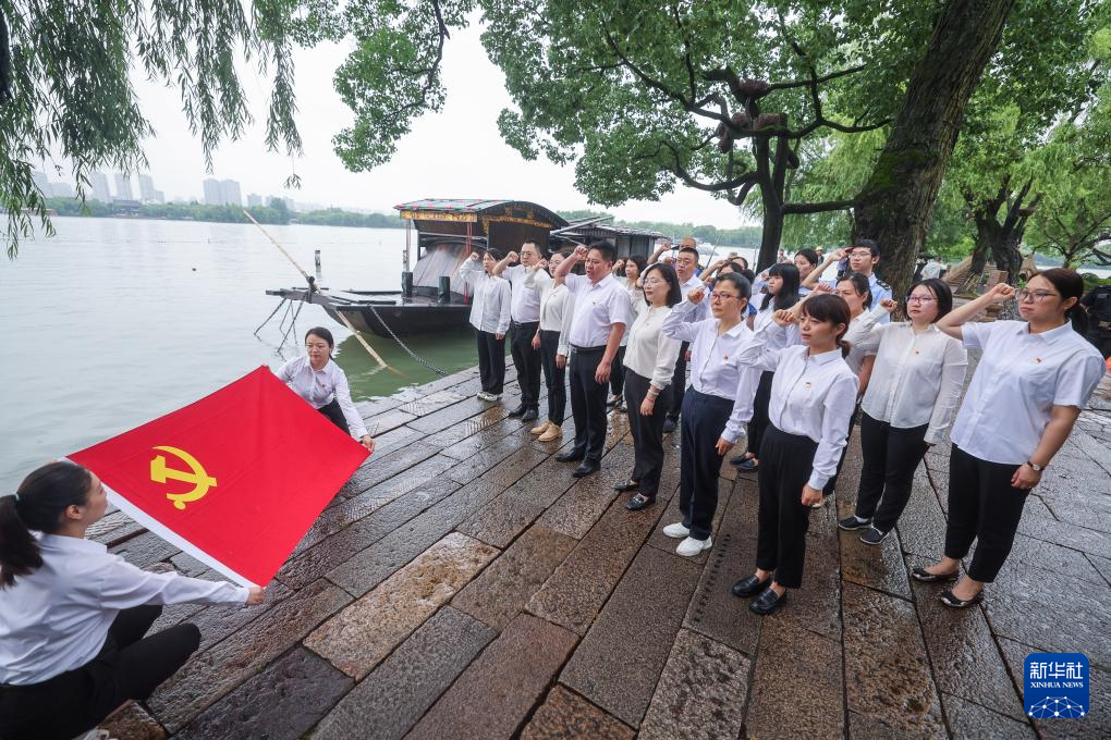 6月28日,黨員們在嘉興南湖紅船旁重溫入黨誓詞。