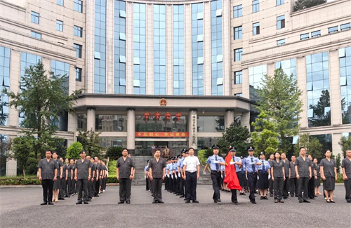 7月1日早上七點半,全體干警及臨聘人員在辦公樓前整齊列隊,肅穆而立。“升國旗,唱國歌”!三名法警組成的國旗護衛(wèi)隊邁著整齊有力的步伐走向升旗臺,出旗、掛旗、甩旗、升旗,動作干凈利索,伴隨著慷慨激昂的國歌,鮮艷的五星紅旗冉冉升起,隨風飄揚,在場人員面向國旗行注目禮,共同見證這莊嚴神圣的一刻。