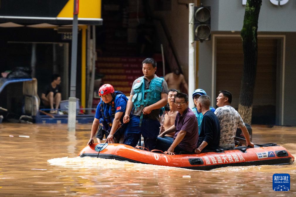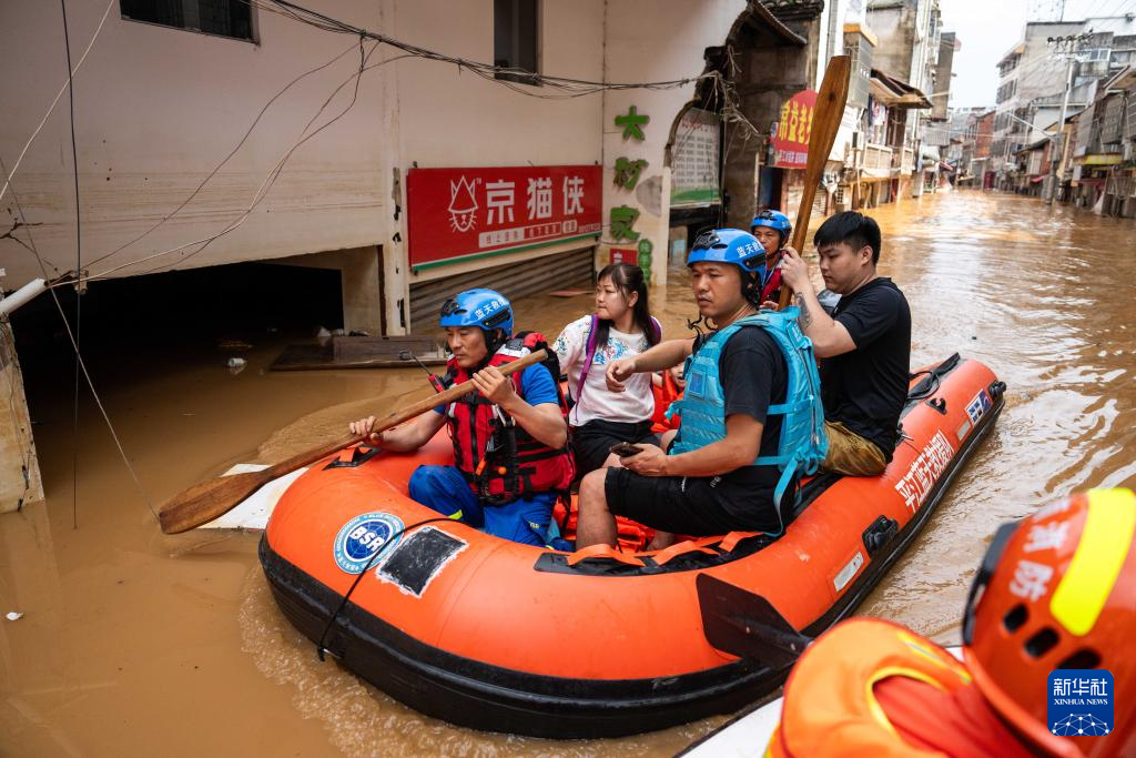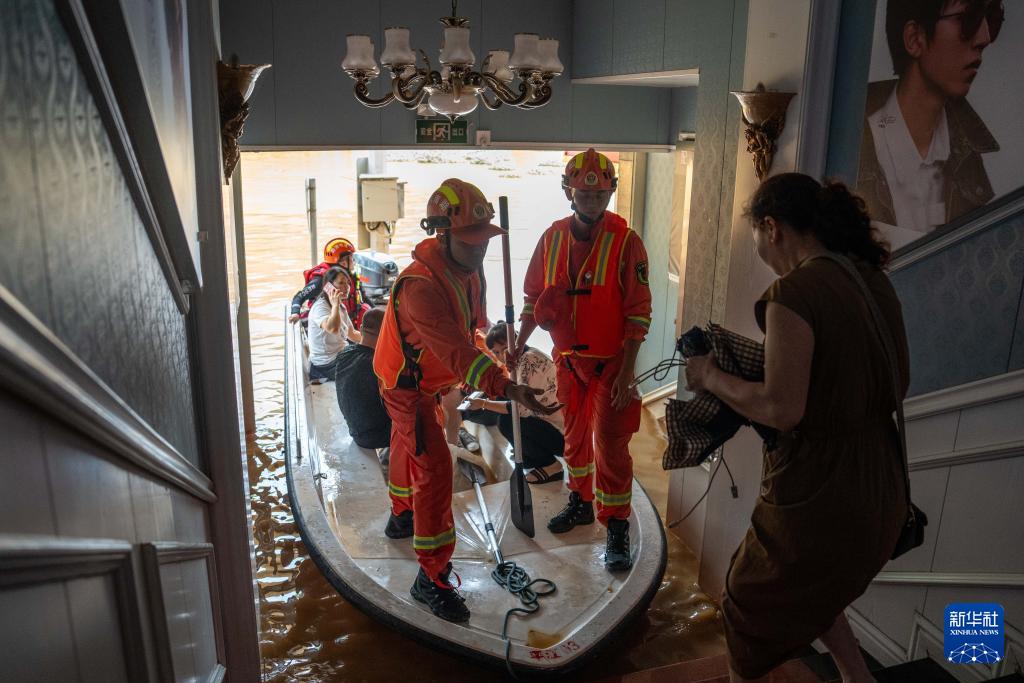 7月2日,在平江縣大橋西路附近,消防員在轉(zhuǎn)移群眾。