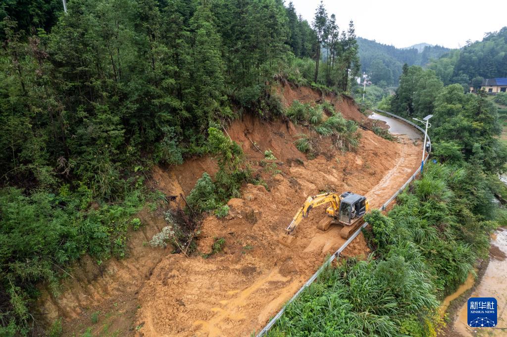 7月2日,挖機在平江縣三市鎮(zhèn)疏通道路(無人機照片)。