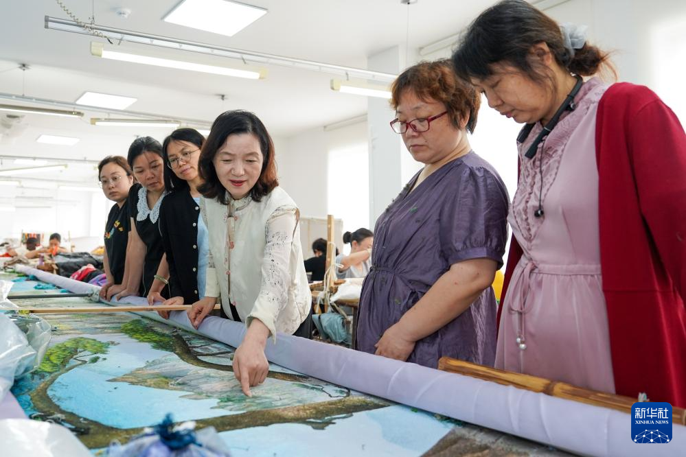 7月3日,國家級非遺項目(蘇繡)代表性傳承人姚建萍(右三)在工作室內(nèi)與繡娘交流蘇繡技藝。