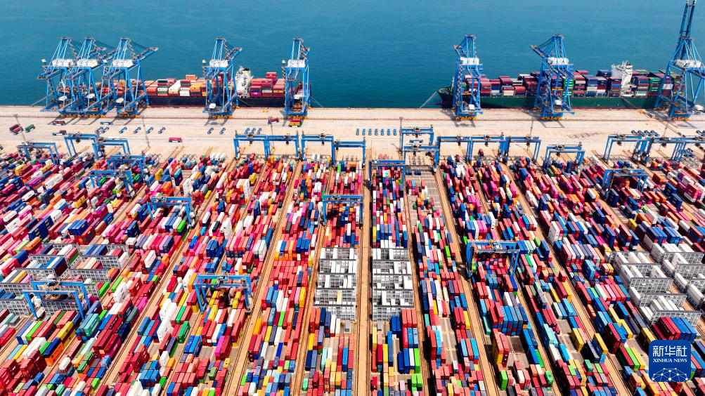 7月3日,在山東港口青島港全自動(dòng)化集裝箱碼頭,輪船在停泊作業(yè)(無(wú)人機(jī)照片)。