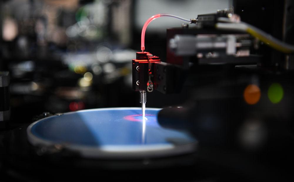 在位于湖北武漢的國家信息光電子創(chuàng)新中心,工作人員在無塵實驗室內(nèi)檢查晶圓(4月30日攝)。