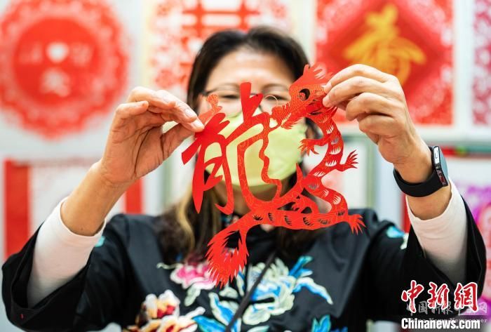 香港中國剪紙文化藝術學會會長孫虹近日接受中新社記者專訪時,現(xiàn)場剪出一幅龍年主題剪紙。中新社記者 侯宇 攝
