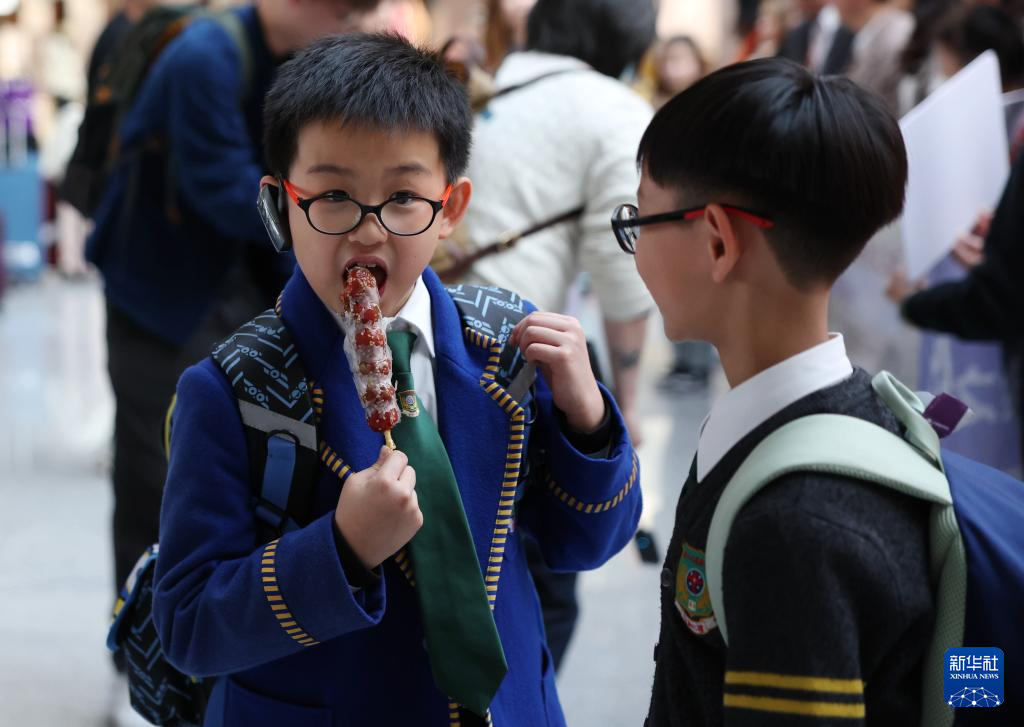3月12日,一名香港小學生在大興國際機場航站樓內品嘗冰糖葫蘆。