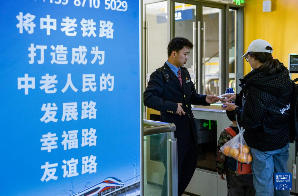 12月1日,中老鐵路化念站工作人員在為旅客檢票。