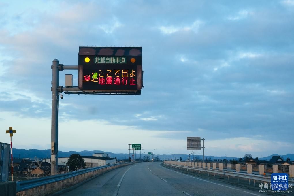 1月1日,日本富山縣小矢部市的高速公路因地震關閉,指示牌提示從此駛出高速公路。