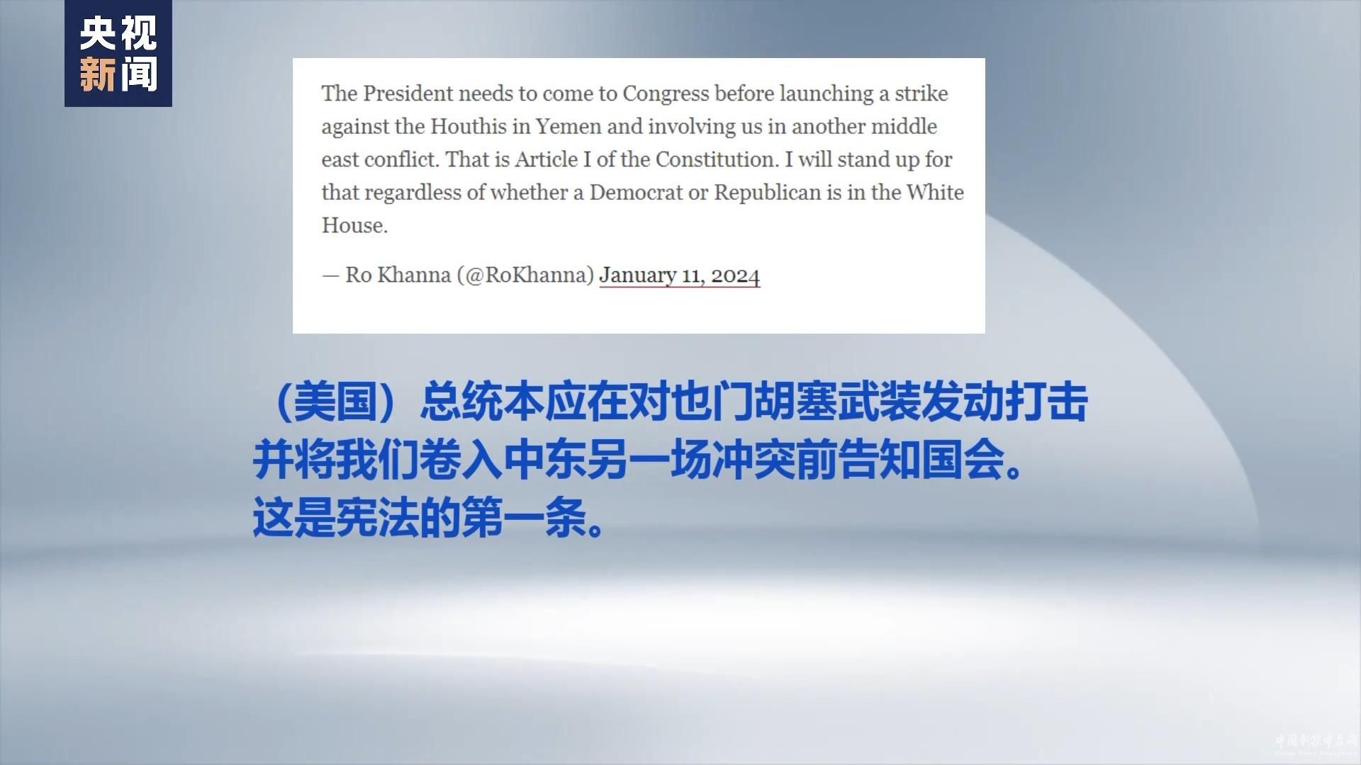美國眾議院議員、民主黨人羅?康納11日在社交媒體上寫道:“總統(tǒng)本應(yīng)在對也門胡塞武裝發(fā)動打擊并將我們卷入中東另一場沖突前告知國會。這是憲法的第一條。”