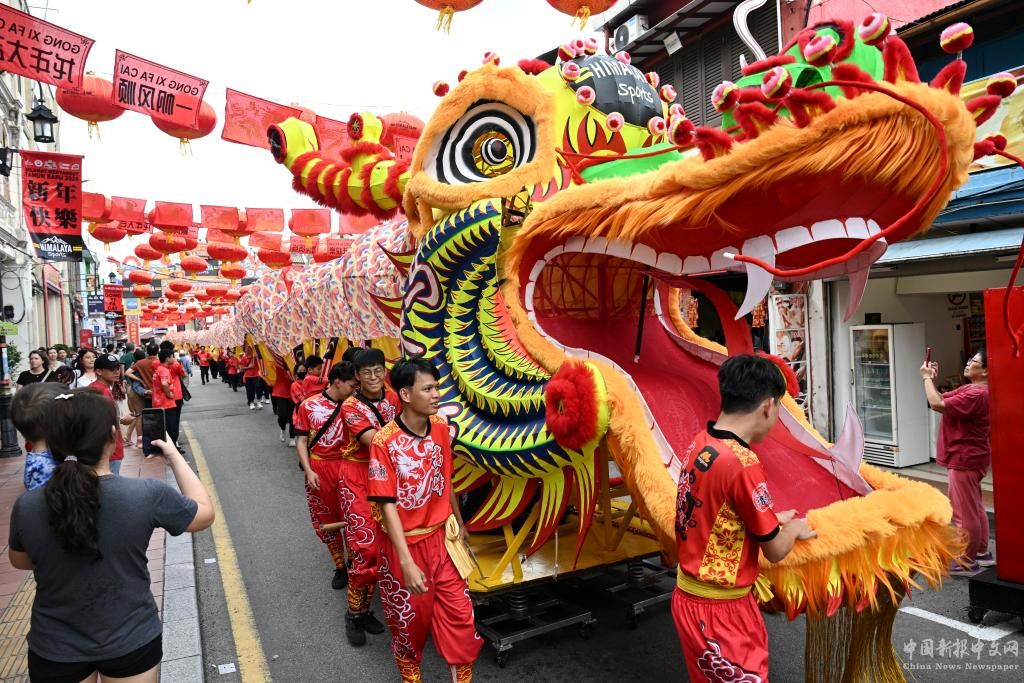 2月1日,由馬來西亞和中國的100多名青少年組成的舞龍隊(duì)在馬來西亞馬六甲市雞場街上共舞一條近200米的“長龍”。這是活動(dòng)現(xiàn)場的“長龍”。新華社記者程一恒攝