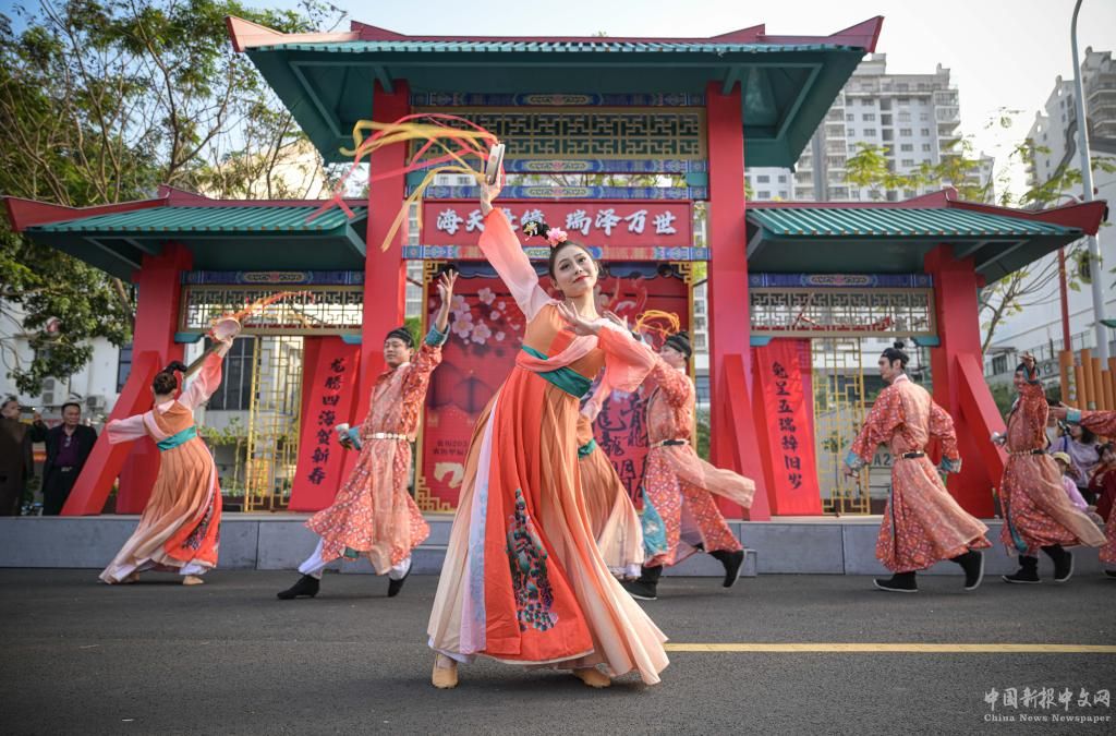 2月12日,在位于海南省??谑械牡谑鶎萌f春會分會場——海瑞文化公園春節(jié)系列活動(dòng)中拍攝的舞蹈演藝現(xiàn)場。新華社記者蒲曉旭攝